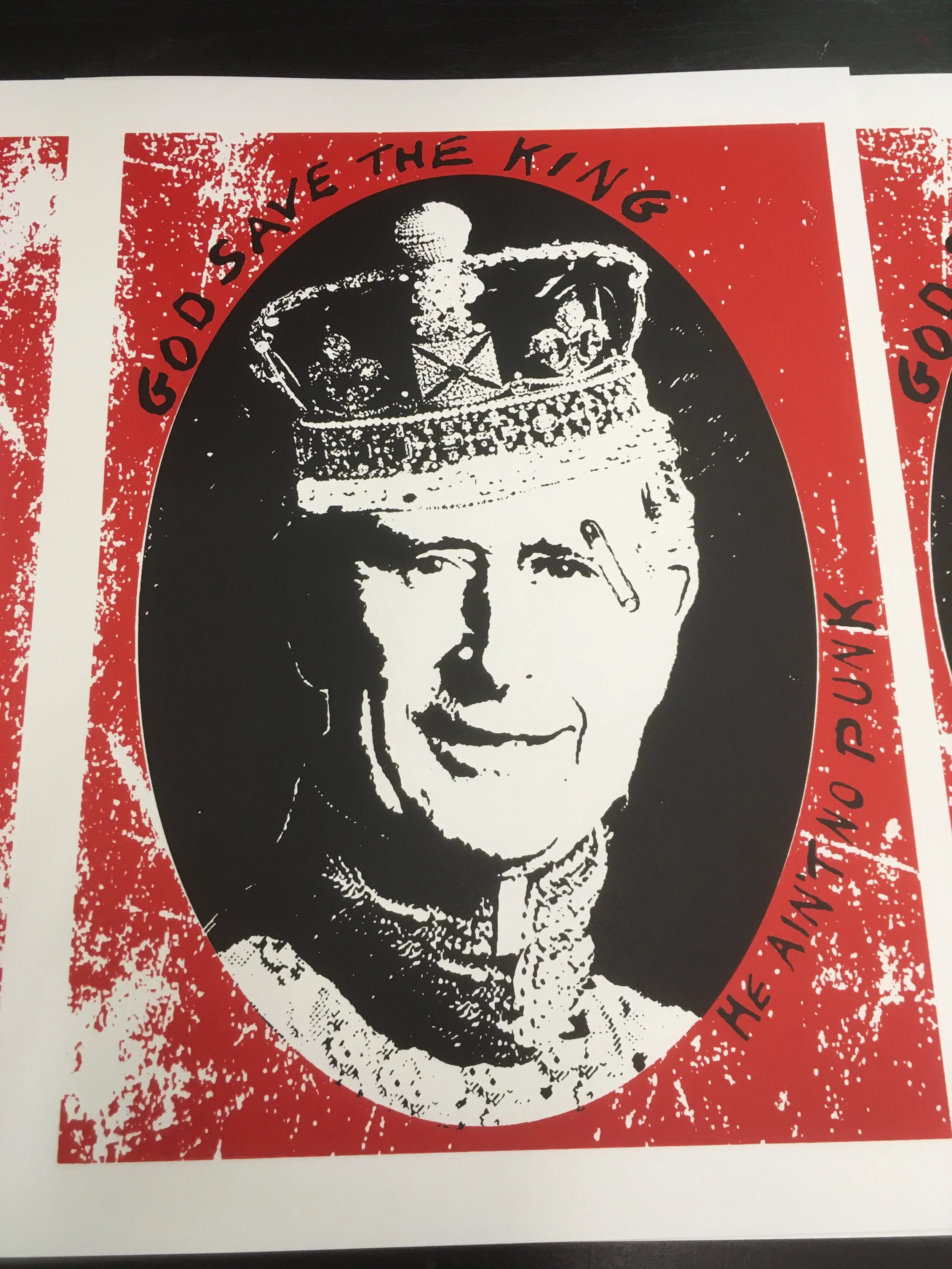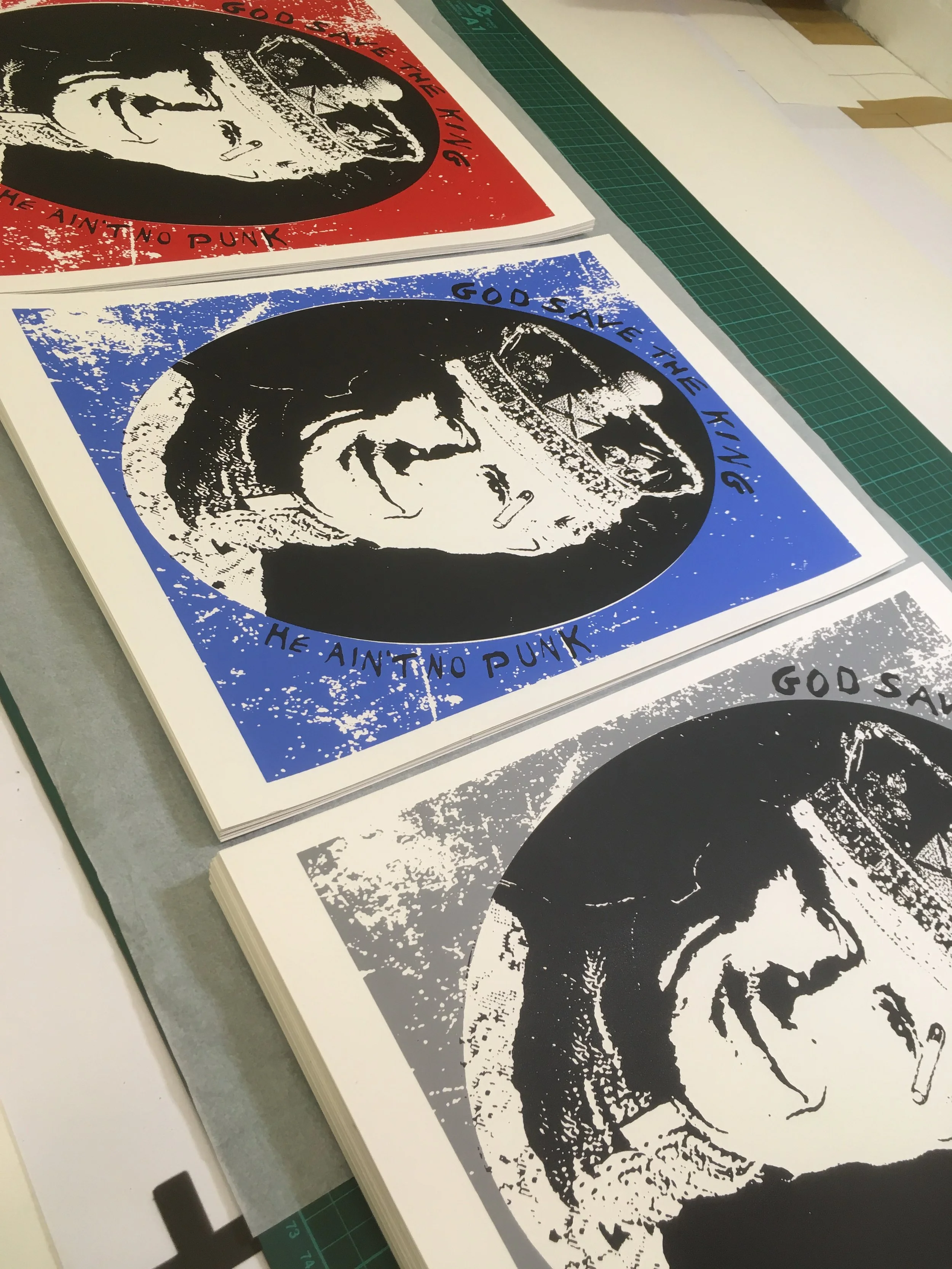 This week we’ve been busy printing with local artist Ziggy. A take on the Jamie Reid GSTQ artwork but this time featuring Charlie. 30 x A3 300gsm cartridge paper with grey, 10 red, 10 blue.